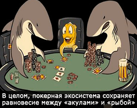 Но, думаю, что самой оптимальной в этом смысле системой является онлайн-игра в Интернете, где совершенно отсутствуют территориальные барьеры. Здесь происходит самостоятельное регулирование системы. Если на каком-то покер-руме собирается слишком много «рыбы», то «акулы» переплывают туда и там начинают игру. Хотя, многие игроки предпочитают какие-то определенные сайты, и, даже, при наличии большого количества сильных игроков не покидают эти сайты, просто потому что они нравятся им больше других.