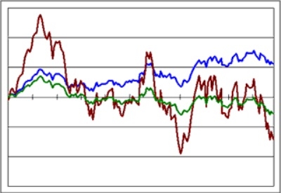 Чтобы понять, как поведение за игровым столом действует на прибыль в долгосрочной перспективе, рассмотрим небольшой конкретный пример. Для наглядности, приведем график. На данном рисунке представлен график изменения числа денежных средств у троих покеристов, которые на протяжении года проводили одинаковые розыгрыши в одинаковых условиях. Первый игрок (обозначен синим цветом) – на протяжении года неизменно, как электронная машина, проводил розыгрыши, беспрекословно соблюдая оба правила. Второй игрок (обозначен красным цветом) – проводил розыгрыши более рискованно, поддаваясь эмоциям и неоправданным ставкам. Красный покерист играл так, как не позволял себе играть синий, поэтому, он много выигрывал, но также много и проигрывал. Третий же покерист (обозначен зеленым цветом) – проводил свои розыгрыши по правилам, практически также как синий игрок, однако может похвастаться меньшими по размеру выигрышами в удачных ситуациях. Каждый из участников на протяжении года попадал в период затяжных неудач, которые продолжались более месяца. Однако стоит отметить, что в период этих неудач красный игрок проиграл больше других.