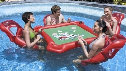 И на последочек еще об одном чудо столе. Сейчас не вызывает сомнений тот факт, что играть в покер можно где угодно. В бассейне, например. Звучит достаточно странно, если и вовсе не сказать, что все это попахивает бредом. Однако не следует спешить с выводами. Спросите американских любителей покера, к примеру, что они думают о покере на воде. Быть может, вы будете несколько удивлены, но в США выпускаются покерные столы для игры на воде. Надувные столы. И стулья тоже. Имея в наличии такие аксессуары, можно даже попробовать организовать «водный» покер рум или большой «водный» турнир.