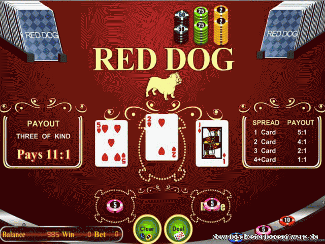 Для Red Dog рoker нужна колода, состоящая из 52 карт. Подсчет ведется довольно просто: карты от двойки до десятки соответствуют своему номиналу, валет – 11, дама – 12, король – 13, туз – 14 (масть во внимание не принимается).