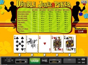 Двойной Джокер Покер является очередным представителем разновидности игровых автоматов, которые кроме стандартной игральной колоды имеют в придачу парочку джокеров. Для тех, кто не любит тратить время на обычный покер, но все же желает заработать крупную денежную сумму в игровом заведении Двойной Джокер Покер может стать идеальным вариантом! Сначала игроку предоставляется возможность попробовать свои силы в специальной, абсолютно бесплатной демонстрационной версии. Этот демо режим кроме того не требует от пользователя прохождения регистрации. Пользуясь такой возможностью, игрок может потренироваться, обдумать свою дальнейшую стратегию, для ее дальнейшего использования во время игры на реальные деньги.