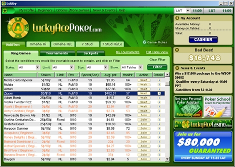 Хотя «Lucky Ace Poker» и появился на просторах интернета лишь несколько лет назад, у него уже есть постоянные посетители, причем разных уровней доходов и с разными предпочтениями. Так что найти себе противника и по карману, и по вкусу, вообще не проблема. В час пик на сайте может находиться около тысячи игроков, большинство из них в это время принимают участие в турнирах.