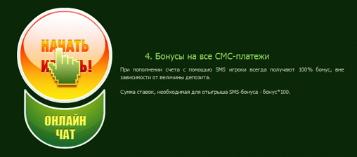Каждому игроку, пополнившему свой личный счет при помощи СМС – платежа, казино Слотико гарантированно предоставляет бонус в размере 100% от суммы пополнения. Чтобы отыграть полученный бонус. Игроку нужно будет поставить в 45 раз больше ставок, чем сумма бонуса. Так, получив 10 долларов, игрок должен поставить 450. До того времени, пока бонус не будет отыгран, игроку запрещено выводить деньги со счета. При этом в счет отыгрыша засчитываются не все ставки. В 100% размере засчитываются лишь ставки, сделанные в кено, колесе удачи и игровых автоматах. Ставки, сделанные во всех видах рулетки, сик-бо и костях, засчитываются лишь на 20%, в видеопокере и покере на 30%.