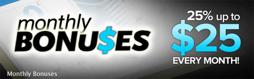 Казино предоставляет своим игрокам бонусы также после уже внесенного ими на свой счет первого депозита. Это так называемый Ежемесячный Бонус. Его начисление дает возможность игрокам увеличить сумму денег на своем счету. Бонус в размере 25% начисляется на каждую, сделанную игроком ставку (но не более 25$). Ежемесячно казино Tower Gaming добавляет эти заработанные игроком бонусы к его первому, внесенному в этот месяц, депозиту. Требования казино к снятию этих бонусных денег аналогичны снятию денег, полученных игроком в виде бонуса за первый депозит.