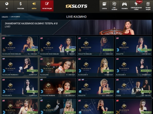 1xSlot live casino предлагает игры с реальными крупье, работающими в студиях нескольких провайдеров софта: NetEnt, Ezugi, Evolution Gaming, Asia Gaming, Portomaso, Vivo Gaming, GamePlay Interactive, Novomatic и других. Дилеры говорят на нескольких языках, а за столами действуют разные диапазоны ставок.