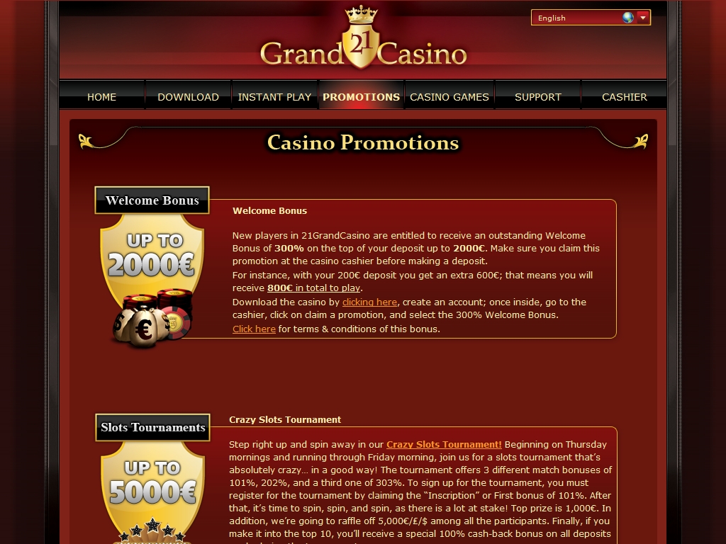 Новые пользователи «21Гранд» получают 300% бонус на первый депозит. Таким образом начисляется до двух тысяч евро.