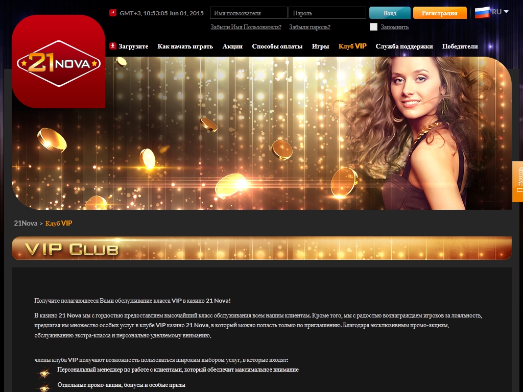 Сайт 21Нова оформлен очень красочно и эффектно. Посетителей встречают огромные баннеры, призывающие испытать новые игры, принять участие в акциях или побороться за прогрессивные джекпоты. Стоит также отметить стильный и запоминающийся логотип, яркую цветовую гамму дизайна и максимально комфортную структуру портала.