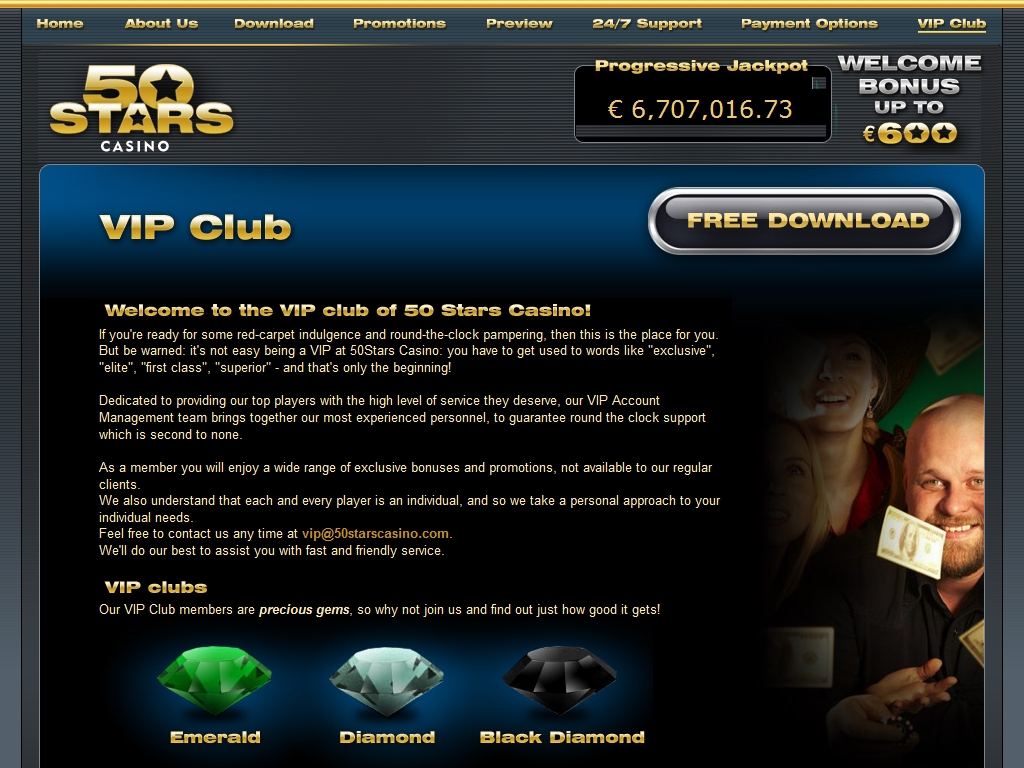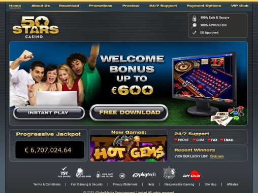 50 Stars Casino работает на платформе Playtech и для игры можно скачать и установить клиентскую программу, так и использовать режим флеш-игры. Казино доступно исключительно на английском языке, а игровыми валютами являются доллары США и евро.