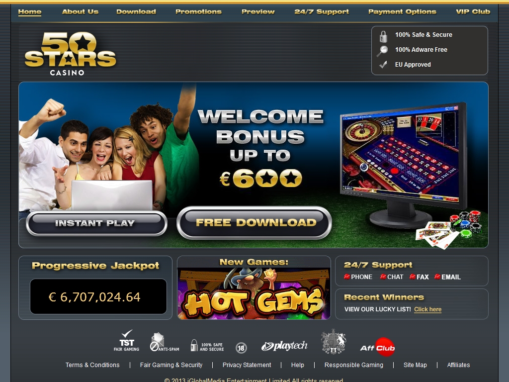 Казино 50 Stars предлагает своим клиентам внушительный ассортимент игр (хотя хотелось бы увидеть также французскую рулетку), отзывчивую службу поддержки, множество вариантов пополнения и вывода средств (включая удобную для многих пользователей систему WebMoney). Заявленную на стартовой странице сумму бонусных выплат в 2000 евро на практике получить вряд ли представляется возможным. Тем не менее даже бонусов на первые три депозита вкупе с бонусами на определенные методы пополнения счета вполне достаточно, чтобы считать их промо-акции хорошими.