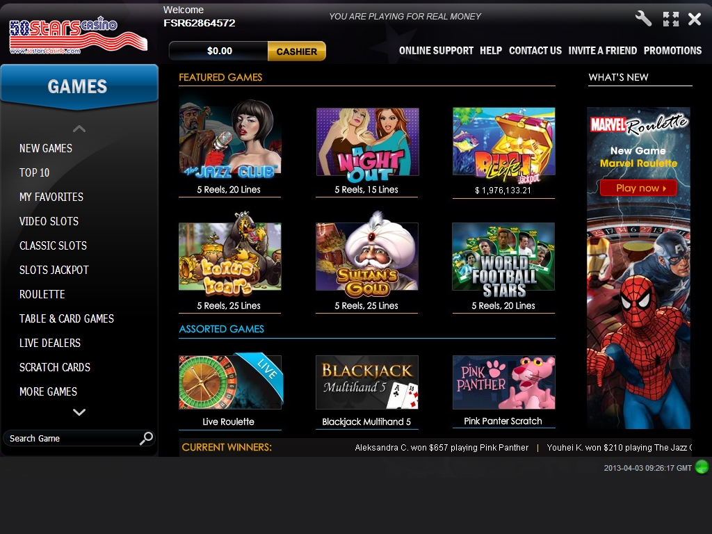 В любом случае, такое оформление казино намного лучше, чем цвета американского флага, которые пестрели на сайте этого заведения до некоторых пор, отпугивая всех, кто не испытывает горячей любви к данной державе. Теперь лишь название 50 Stars («50 звезд») говорит о том, что американская тема не забыта.