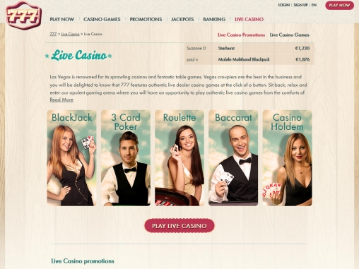 С реальными крупье, работающими в специальной студии, в 777 casino можно играть в блэкджек, 3-карточный покер, баккара, холдем и на рулетке. Подробнее о лайв-играх данного заведения читайте в отдельном обзоре на нашем портале.