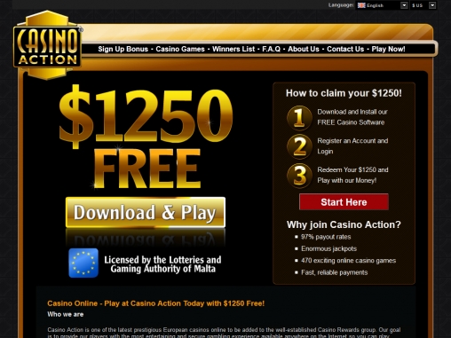 В оформлении сайта казино Action преобладает насыщенный золотой цвет, по которому постоянно пробегают световые блики. Анимированная стильная реклама на главной странице перечисляет основные преимущества заведения. Также взор манит внушительная сумма бонуса и постоянно растущий прогрессивный джек-пот. Чуть ниже можно ознакомиться с различной информацией о казино и увидеть логотипы компаний-партнеров.