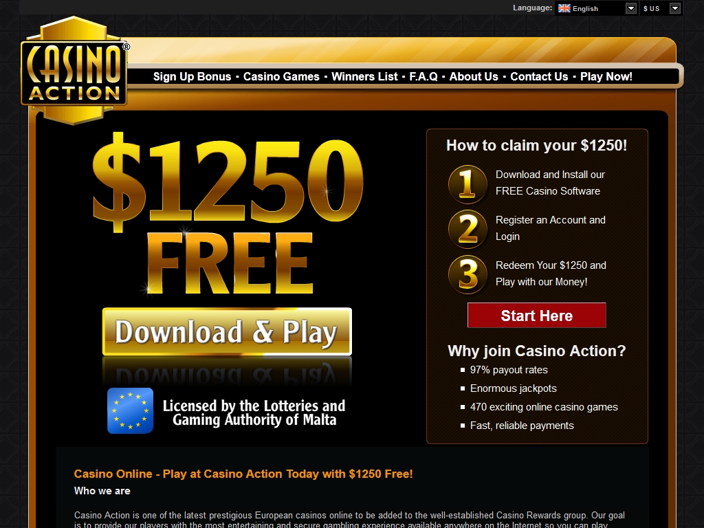 Casino Action принадлежит к авторитетной в игорном мире группе казино CasinoRewards, так что сомневаться в его высочайшем уровне не приходится. Оно осуществляет деятельность по лицензии, выданной властями Мальты, и строго в соответствии с законодательством этой страны.
