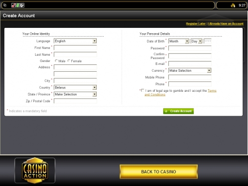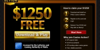 В казино Action действует очень заманчивый для игроков бездепозитный регистрационный бонус. Каждый новый игрок, который завел себе аккаунт для игры на реальные деньги, получает $1250, на которые он может играть в течение одного часа. За это время он должен сделать не менее двадцати ставок в специально отведенных для этого играх и выиграть не менее $20 сверх предоставленной ему суммы. Максимальная сумма выигрыша по этой акции составляет $100. Чтобы получить выигрыш, он должен будет сделать первый депозит в размере от $40. Если даже новому клиенту казино не удалось ничего выиграть, ему предоставляется шанс стать обладателем определенной суммы на «Колесе второго шанса».