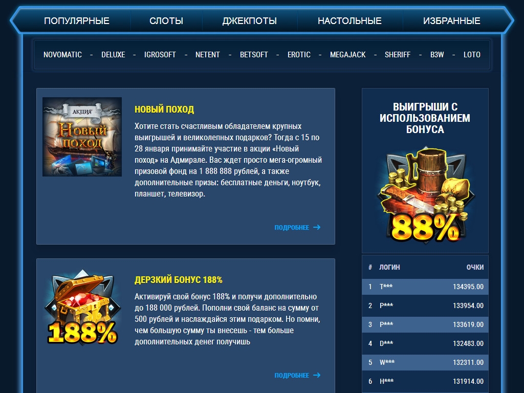 «Адмирал 888» предлагает клиентам старинные игровые аппараты и неоригинальные слот-машины Novomatic, Megajack, Igrosoft, Sheriff, B3W и других брендов.