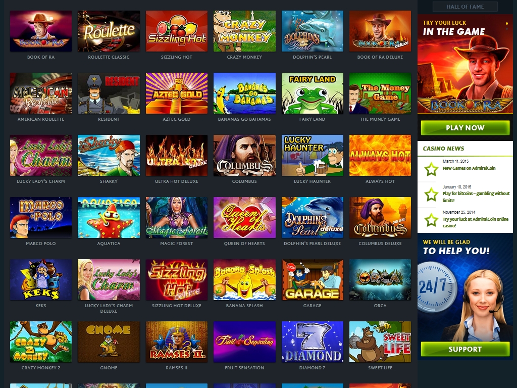 Выбор моделей откровенно небогат. Есть несколько десятков видео-слотов, а также две рулетки. На admiralcoin.com все игры разбиты на четыре группы: