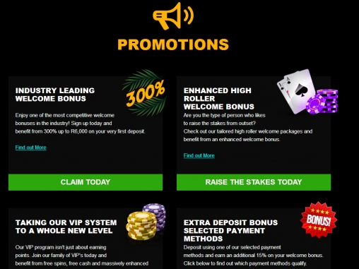 - Новичкам на первый депозит начисляется 300% бонус до шести тысяч рэндов.