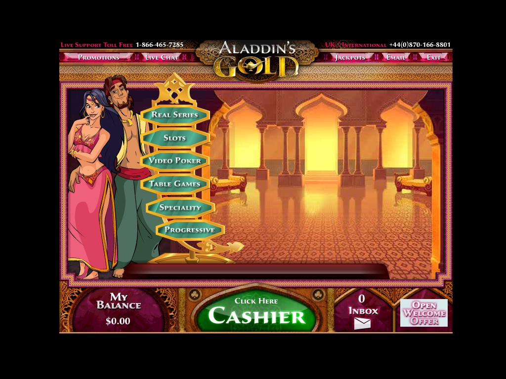 Онлайн казино Aladdin’s Gold хорошо известно в игорном бизнесе. В свое время оно стало одним из первых клиентов компании Real Time Gaming, с которой благополучно сотрудничает по сей день. Посетителей этого казино с удивительной графикой и анимацией ждут большой выбор игр, солидная бонусная программа и высокий уровень сервиса.