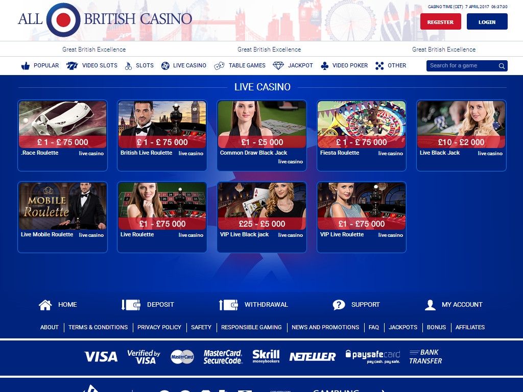 В All British live casino предлагаются игры с реальными дилерами, которые работают в оффлайновом казино Portomaso на Мальте. Используется программное обеспечение NetEnt. Процесс транслируется в режиме настоящего времени. Здесь можно играть только на деньги. В таком формате предлагаются несколько версий блэкджека, рулетки и покера. Есть даже live roulette для мобильных устройств.