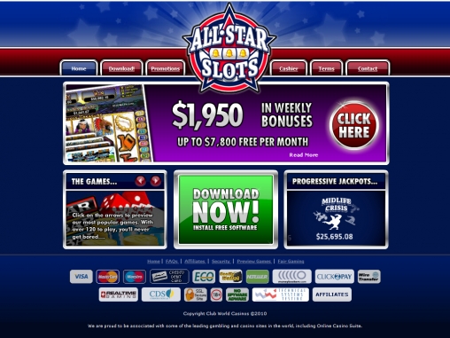 Дизайн All Star Slots Casino не блещет особой оригинальностью. В глаза сразу же бросается очень крупный логотип казино, в котором на фоне пятиконечной звезды изображены три барабана и название заведения. На главной странице постоянно сменяют друг друга анимированные баннеры с рекламой бонусов, промо-акций, прогрессивных джек-потов и так далее. В оформлении сайта преобладают синие и красные тона.