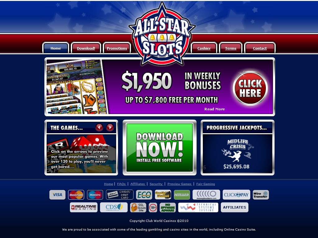 Прочитав название казино All Star Slots, можно подумать, что оно целиком и полностью посвящено игровым автоматам. Однако это не совсем так. Конечно, именно слотов в данном заведении больше всего (как и почти во всех интернет-казино), но других игр (карточных, настольных, видео-покеров и так далее) здесь также предостаточно. Все они предоставлены известным производителем Real Time Gaming.