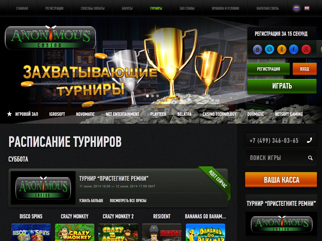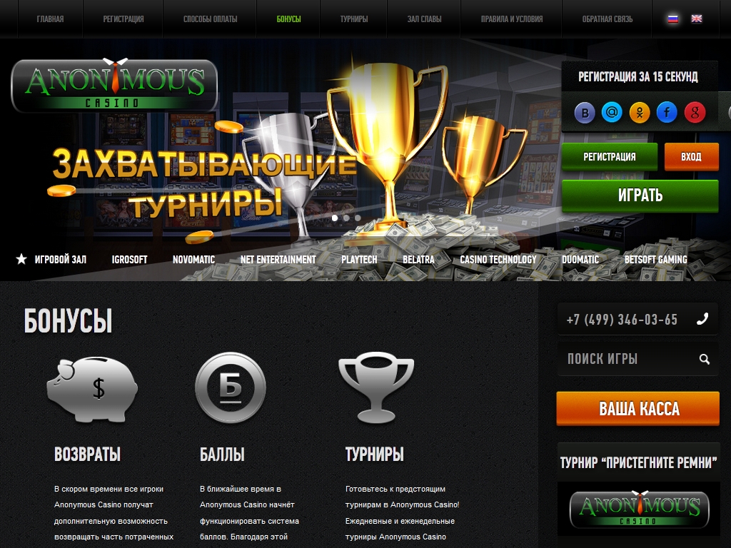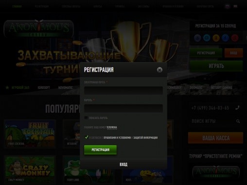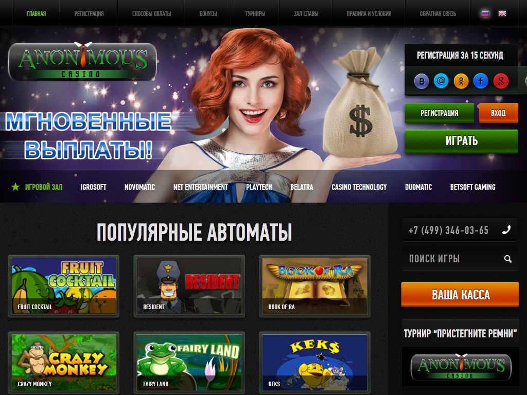 Anonymous Casino предлагает своим игрокам все то, что они так любят: современный дизайн казино, легендарные игровые автоматы от ведущих производителей,а также различные бонусы и быстрые выплаты.