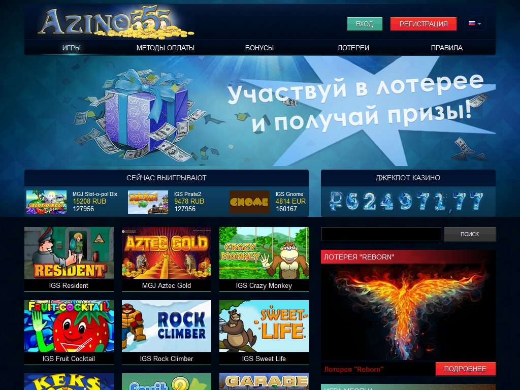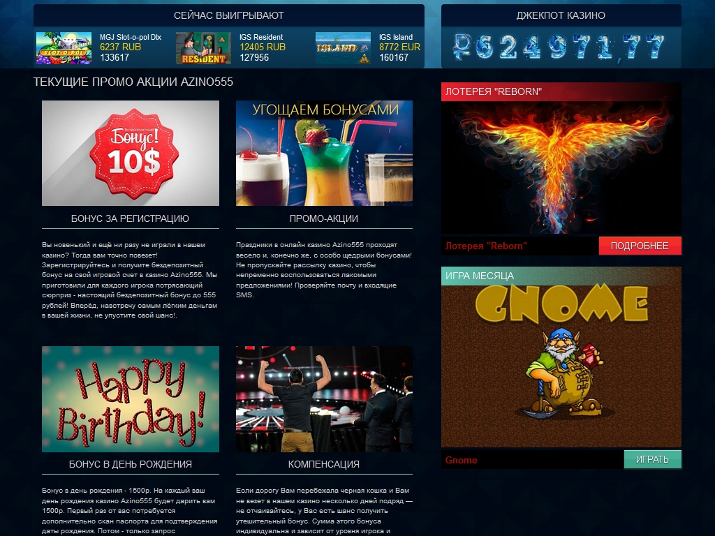 Обсуждаемое далее в статье онлайн-казино привлекает клиентов бесплатным бонусом за регистрацию, розыгрышем накопительного джекпота, несколькими поощрительными акциями и другими предложениями, о которых вы узнаете из обзора Azino555.