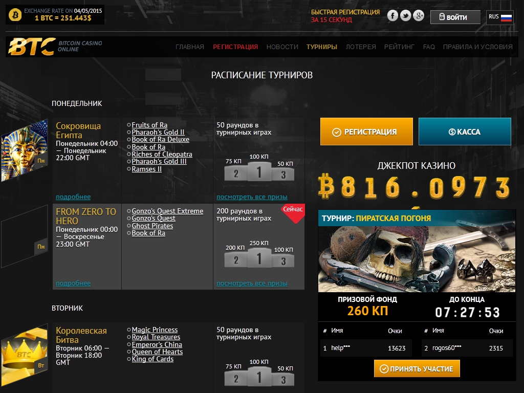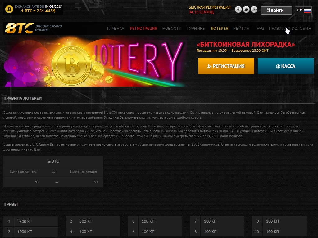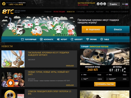 BTC является весьма неплохим игорным сайтом для тех, кто предпочитает использовать биткойны. Внушительный выбор моделей, классные турниры, русскоязычный интерфейс и сотрудники поддержки, широкий диапазон ставок, наличие лотереи и программы лояльности – вот лишь некоторые из его плюсов.