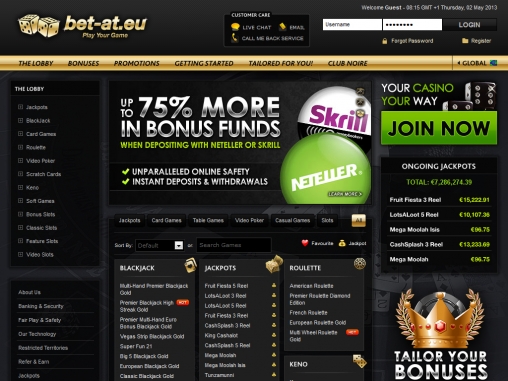 Bet At Eu Casino вызывает интерес, в первую очередь, необычными бонусными предложениями. Приятно, что каждый клиент может сам выбрать интересующий его пакет. Выбор игр в казино не самый большой, но их более чем достаточно для большинства клиентов. Также радует возможность пополнения счета через WebMoney.