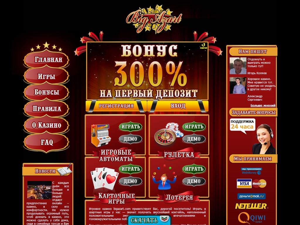 Большой азарт – заведение, политика которого направлена на русскоговорящих игроков. Пока заведение нельзя назвать лидером среди интернет-порталов даже на российском рынке. Но Big Azart является "середнячком", где игроки могут приятно провести время.