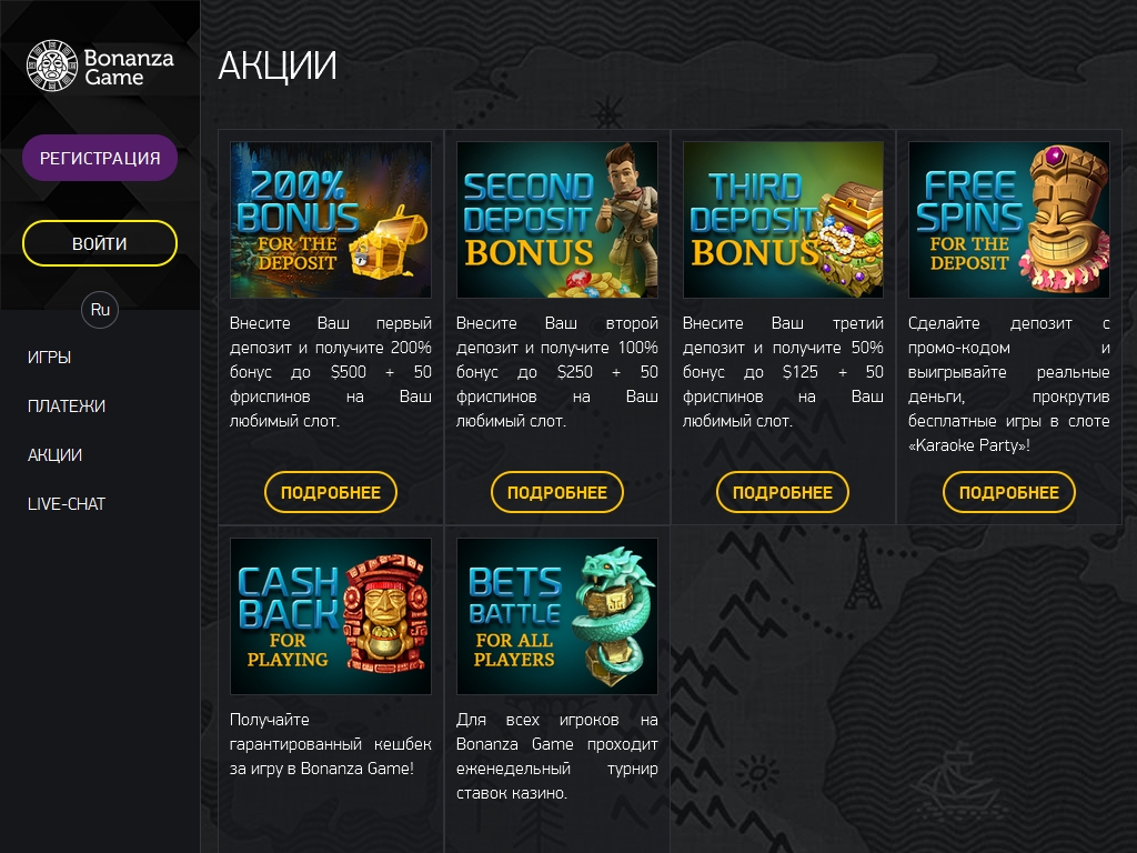 Рассматривая систему поощрительных акций казино Bonanza Game, сначала остановимся на пригласительных бонусах для новичков. Они начисляются на первые три пополнения счета:
