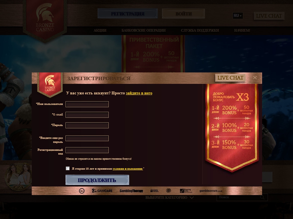 Вы не сможете открыть счет и играть на деньги в Bronze, если живете в США или другой стране из списка исключенных территорий. Удостоверьтесь, что вам можно пользоваться услугами портала.