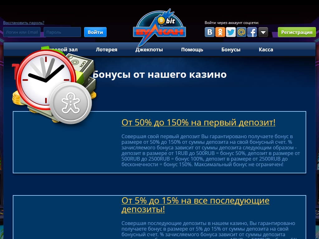 В Vulkan-Bit есть ряд заманчивых поощрительных акций. Прежде всего, это бонус на первый депозит, который вносит на счет новый клиент. Его размер может быть от 50% до 150% (от 500 до 2500 рублей), что зависит от суммы пополнения.
