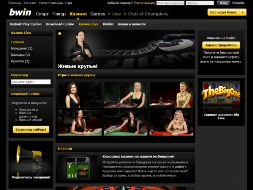 В bwin можно играть также с настоящими дилерами, работающими в специальной студии. Здесь представлены несколько столов для блэкджека, баккара, рулетки и казино холдем-покера. Они различаются диапазонами ставок и некоторыми другими нюансами. Больше информации о лайв-казино «Бвин» вы найдете в отдельном обзоре данного раздела.