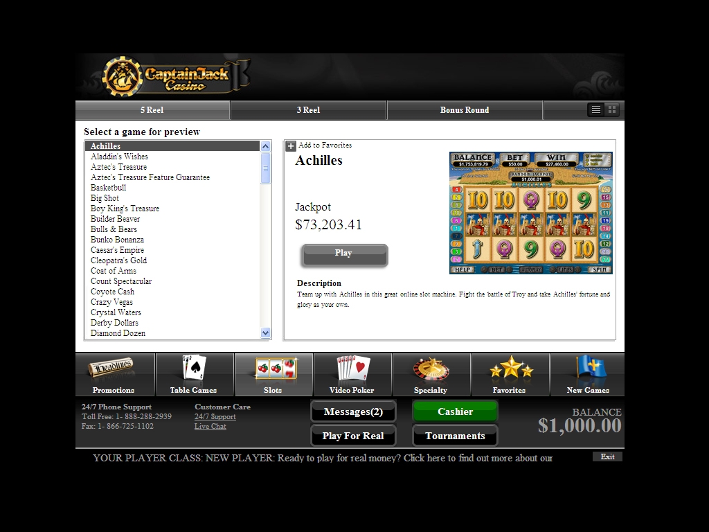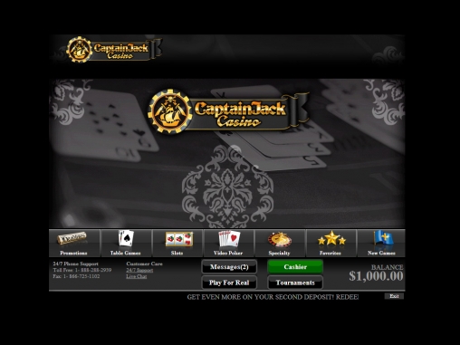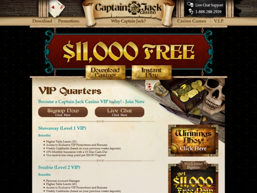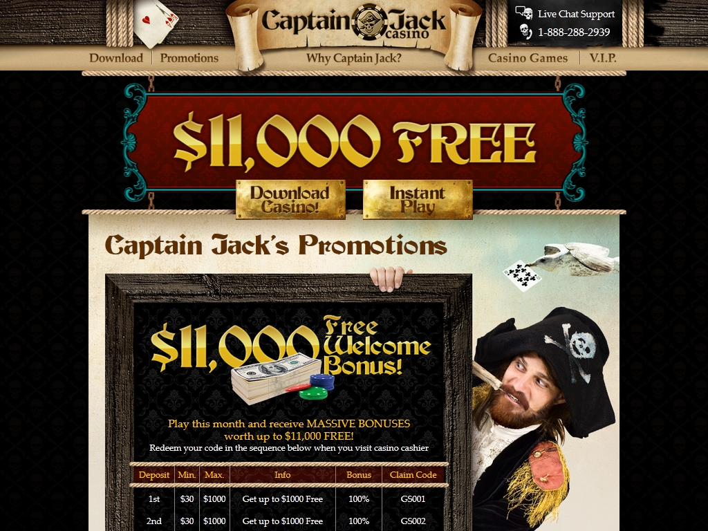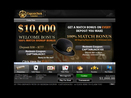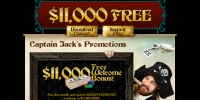 Поощрительная программа Captain Jack поражает воображение. Начнем с того, что на первые десять депозитов (от тридцати долларов каждый), которые новый клиент переводит на счет после регистрации аккаунта, ему начисляются бонусы (до одной тысячи долларов каждый). Большинство из них 100%, лишь пятый по счету равен 50% общей суммы предыдущих депозитов, а десятый равен полной сумме всех пополнений.