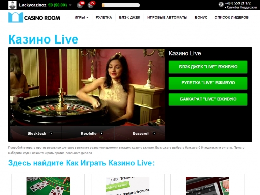 Room также предлагает своим пользователям возможность сыграть в наиболее популярные игры с живыми дилерами. Среди предлагаемых игр блэк-джек, баккара и европейская рулетка. Чтобы испытать данную услугу, нужно в разделе «Казино Live» выбрать интересующую вас игру, сделать депозит на свой счет (так как живые игры доступны лишь на реальные деньги), выбрать стол и дилера. Кстати, на сайте есть анкеты нескольких девушек-крупье, ознакомившись с которыми, вы сможете выбрать наиболее интересную вам сотрудницу казино.