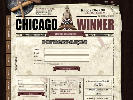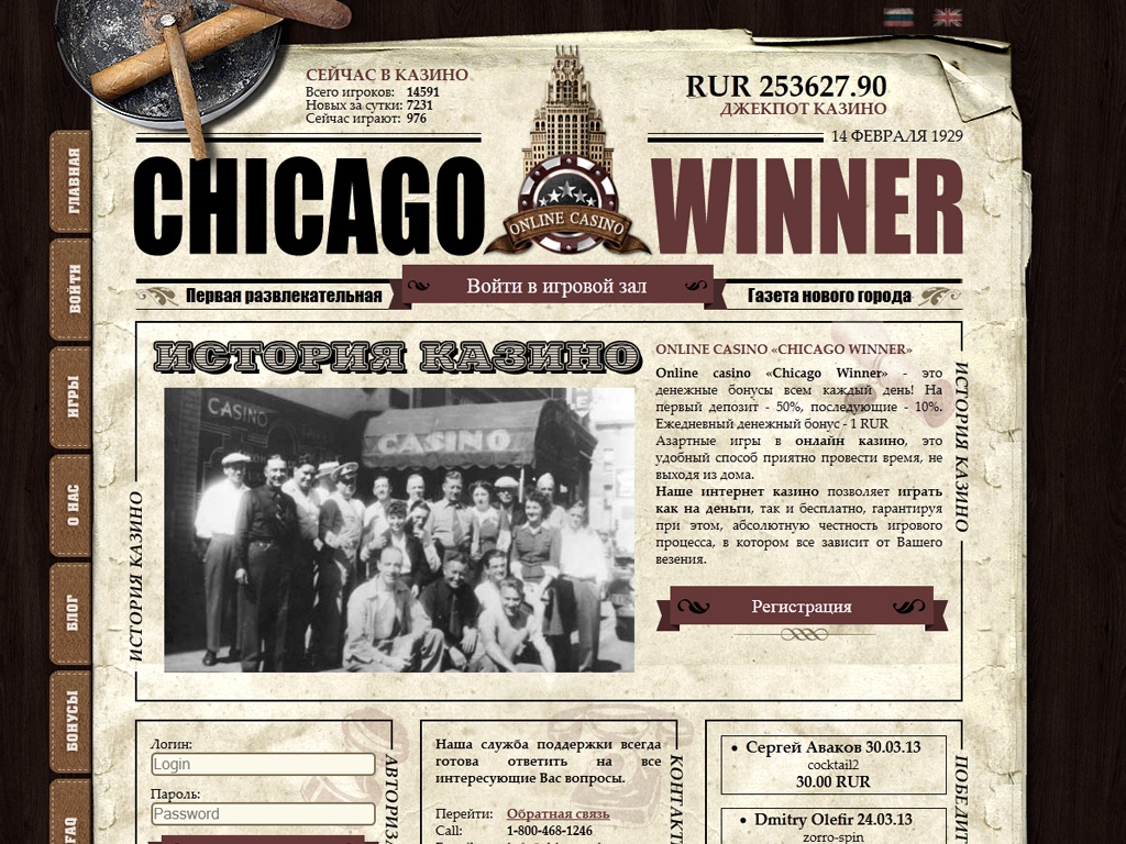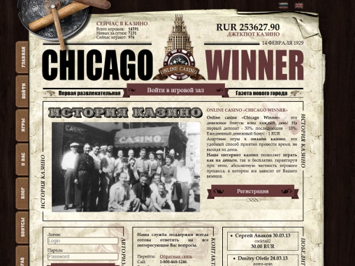 Все разделы сайта казино имитируют страницы потрепанного номера газеты Chicago Winner, который датируется четырнадцатым февраля 1929 года. Надо сказать, стилизация удалась на славу, поэтому будет интересно даже просто полистать газету и посмотреть старые фотографии, среди которых есть очень любопытные. Несмотря на необычное оформление, пользоваться сайтом Chicago Winner Casino несложно, потому что его структура весьма логична и предсказуема.