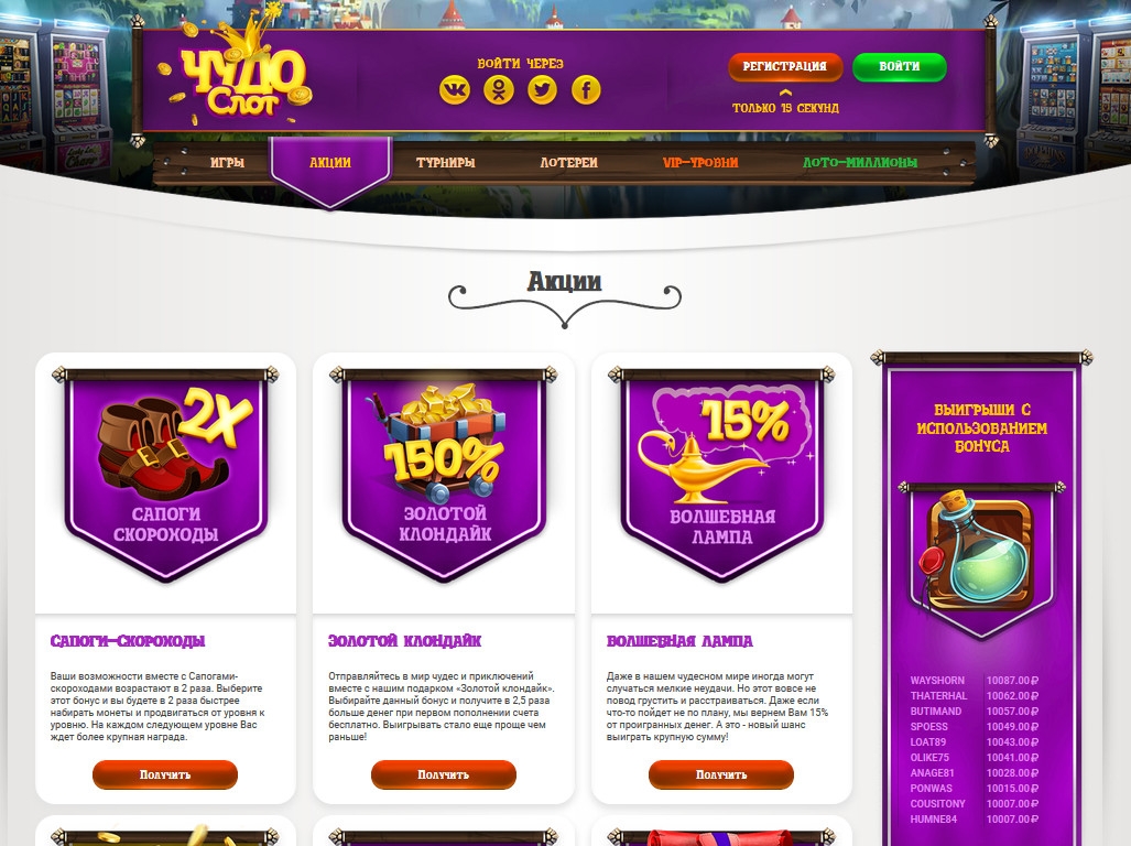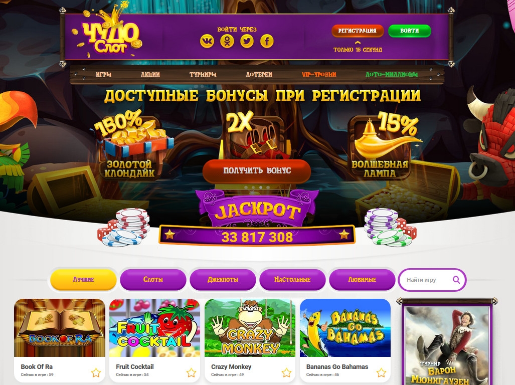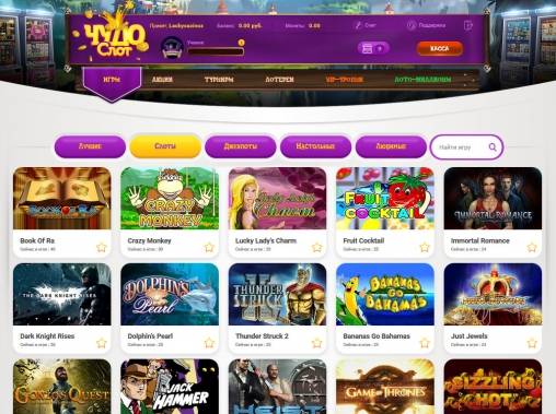 Данный обзор посвящен русскоязычному игорному сайту chudoslots.com, где предлагаются разные игры, многочисленные поощрительные акции, турниры между клиентами, лотерея и другие виды услуг, о которых рассказывается далее в статье.