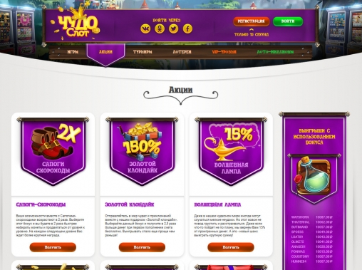 ChudoSlot обладает очень ярким дизайном. На страницах портала изображены герои популярных слотов, красочные баннеры, веселые тематические картинки, иконки игровых автоматов и другие броские элементы. Подобное оформление может показаться излишне пестрым, но это дело вкуса. В целом, пользоваться ресурсом удобно.