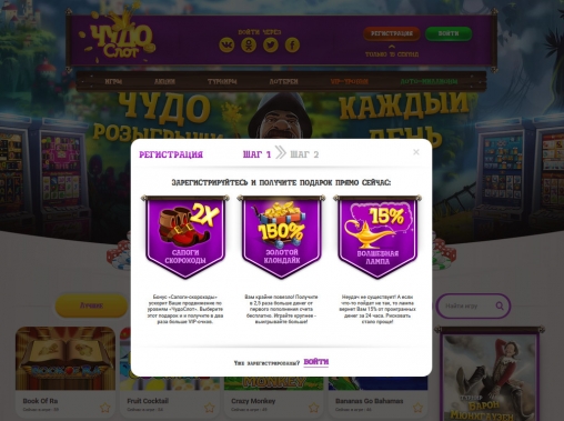 Обсуждение поощрительной программы ChudoSlot начнем с рассмотрения приветственных бонусов. При регистрации новички выбирают одну из трех акций: