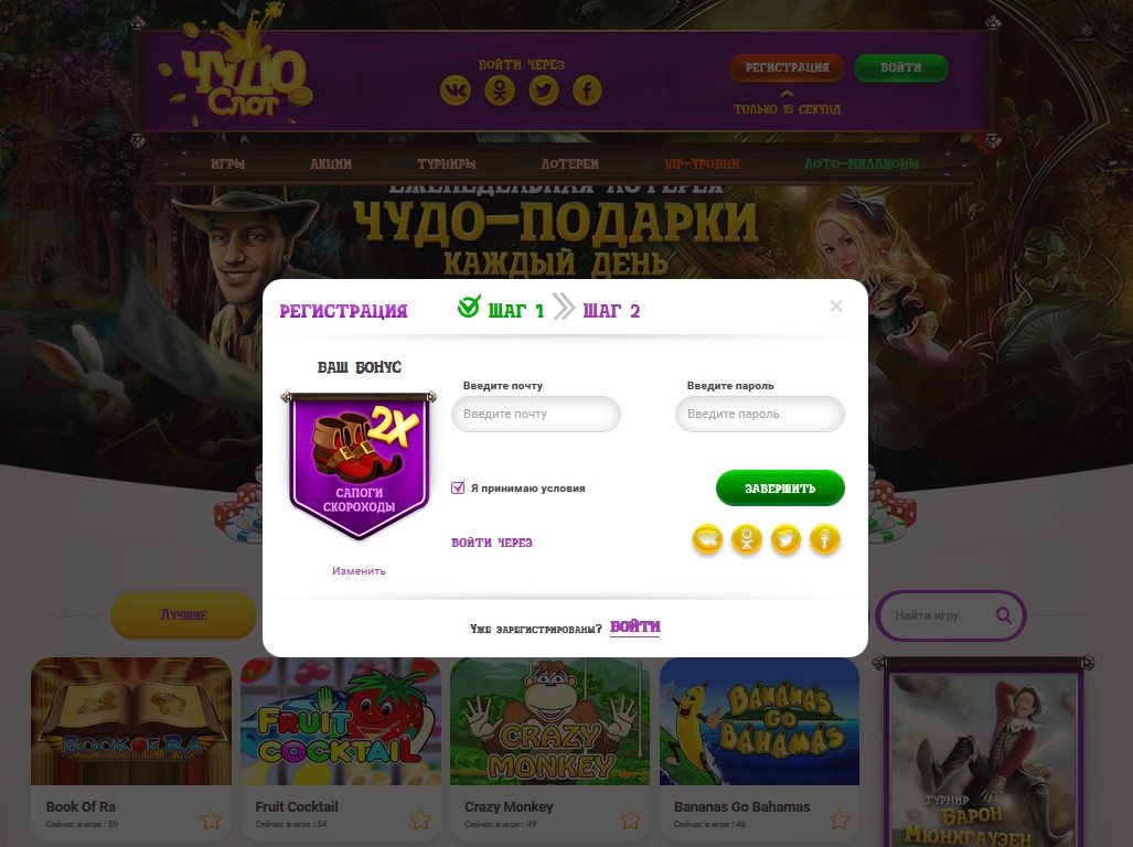 Зарегистрироваться в казино ChudoSlot можно за несколько секунд. При открытии счета нужно выбрать желаемый тип бонуса, ввести контактный адрес электронной почты и выбрать пароль. Разрешается входить через аккаунты в социальных сетях.
