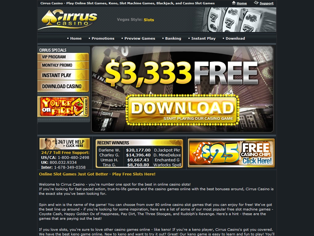 Портал Casinoz предлагает вашему вниманию обзор оригинального онлайн-казино Cirrus, которое работает на софте RTG и делает клиентам множество интересных предложений в виде бонусов, турниров, розыгрышей и прочих увлекательных акций.