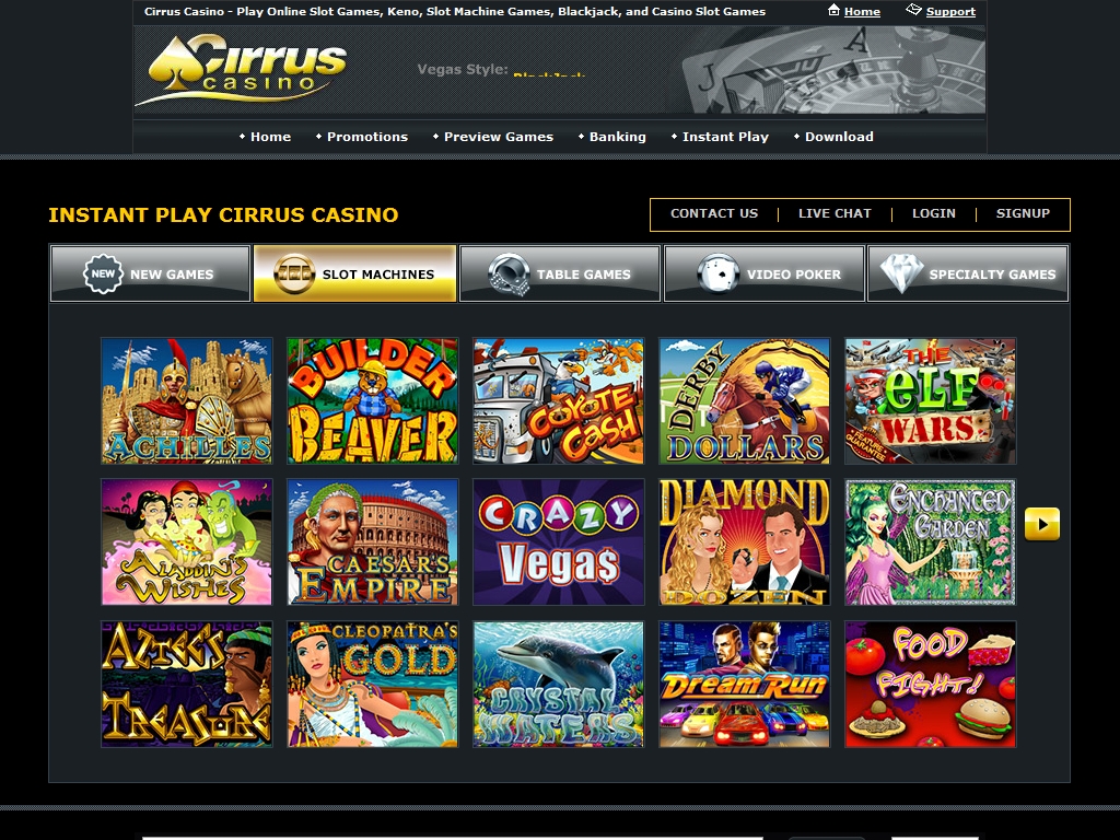 Cirrus Casino предлагает клиентам более восьмидесяти азартных онлайн-игр всех самых распространенных жанров. Вы найдете здесь отличный выбор качественных видео-слотов с разными функциями, основные настольные, карточные и развлекательные игры, а также несколько видео-покеров.