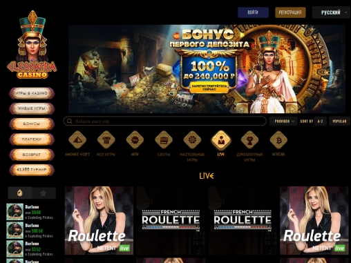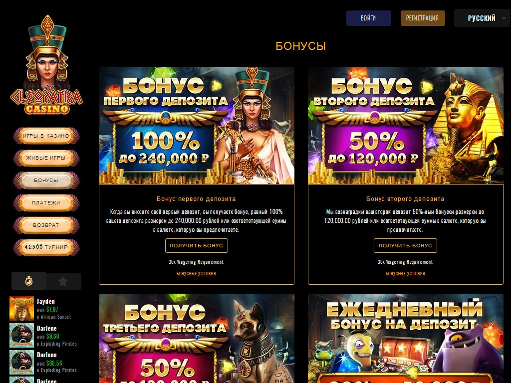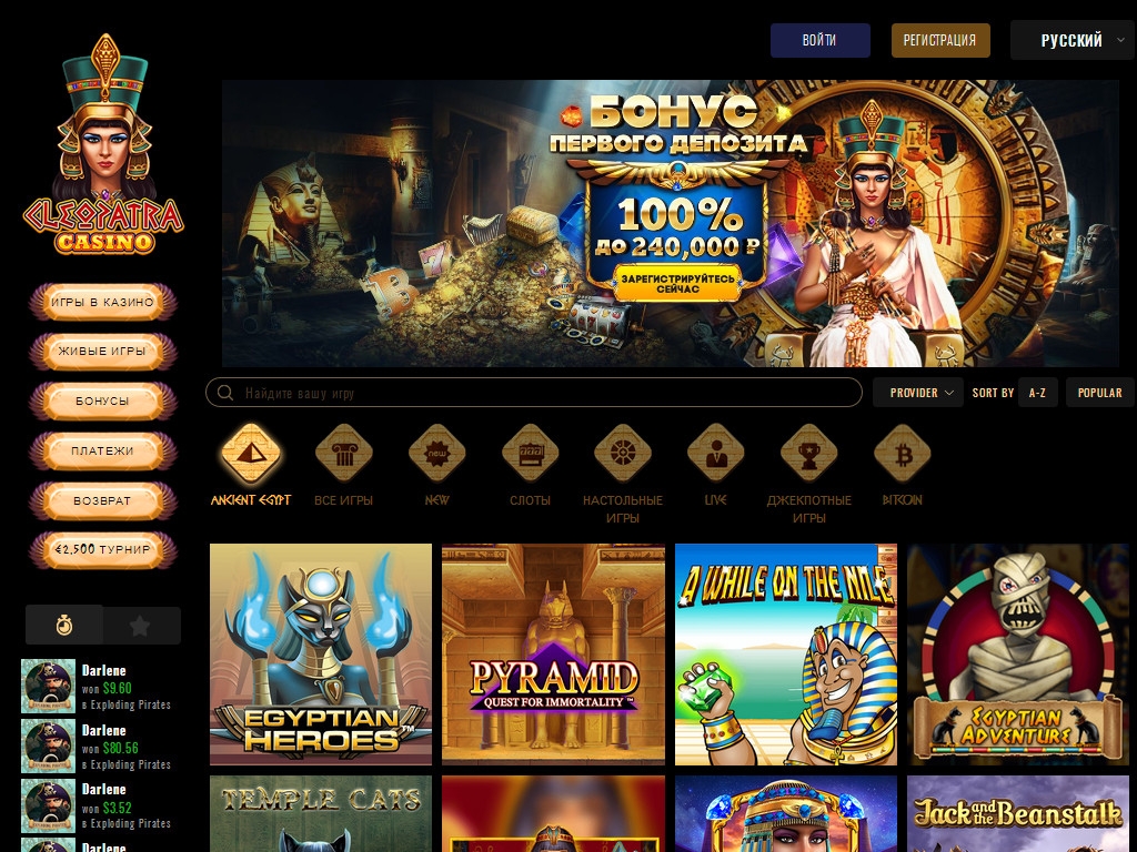 Cleopatra принимает разные денежные единицы, включая рубли, доллары, евро и биткойны. Вносить депозиты и выводить деньги со счета можно банковскими картами, электронными кошельками и другими способами, перечисленными в разделе «Платежи».