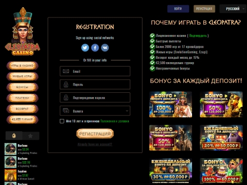 Чтобы завести счет и получить возможность играть в казино Cleopatra на деньги, нужно зарегистрироваться. Процесс займет не более пары-тройки минут. Необходимо лишь заполнить небольшую анкету и подтвердить контактные данные.