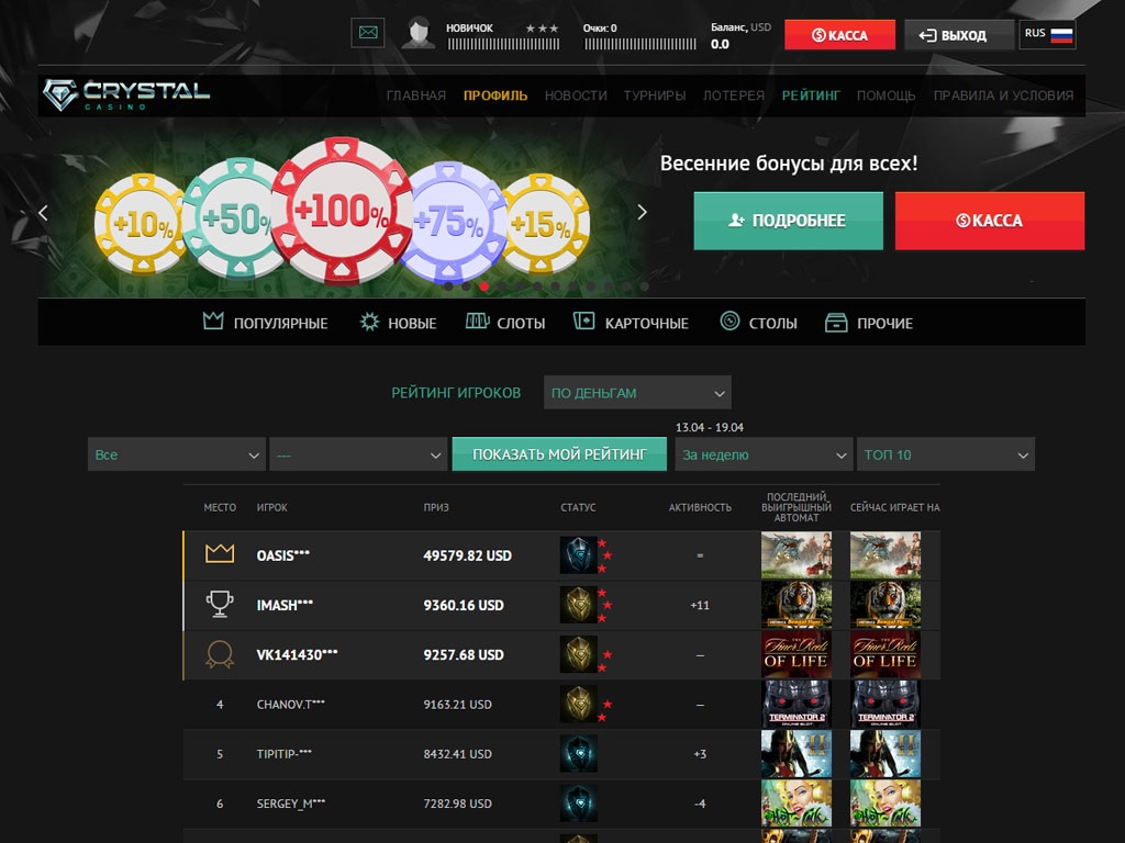 Это все лож.Не играйте в максе и в кристалле это самое лживое казино.В начале все делают как в др клубах,ну в смысле дают поинты и бонусы а потом ........Пипец выигрыш не дают,в турнире якобы нужно ждать очереди и вывод ден.ср тоже!Не верьте!!!Что бы не говорили вначале ,все будет дальше только хуже.Свой и опыт друзей.Они думают что если играют,т не общаються! Они ошибаются!!!!