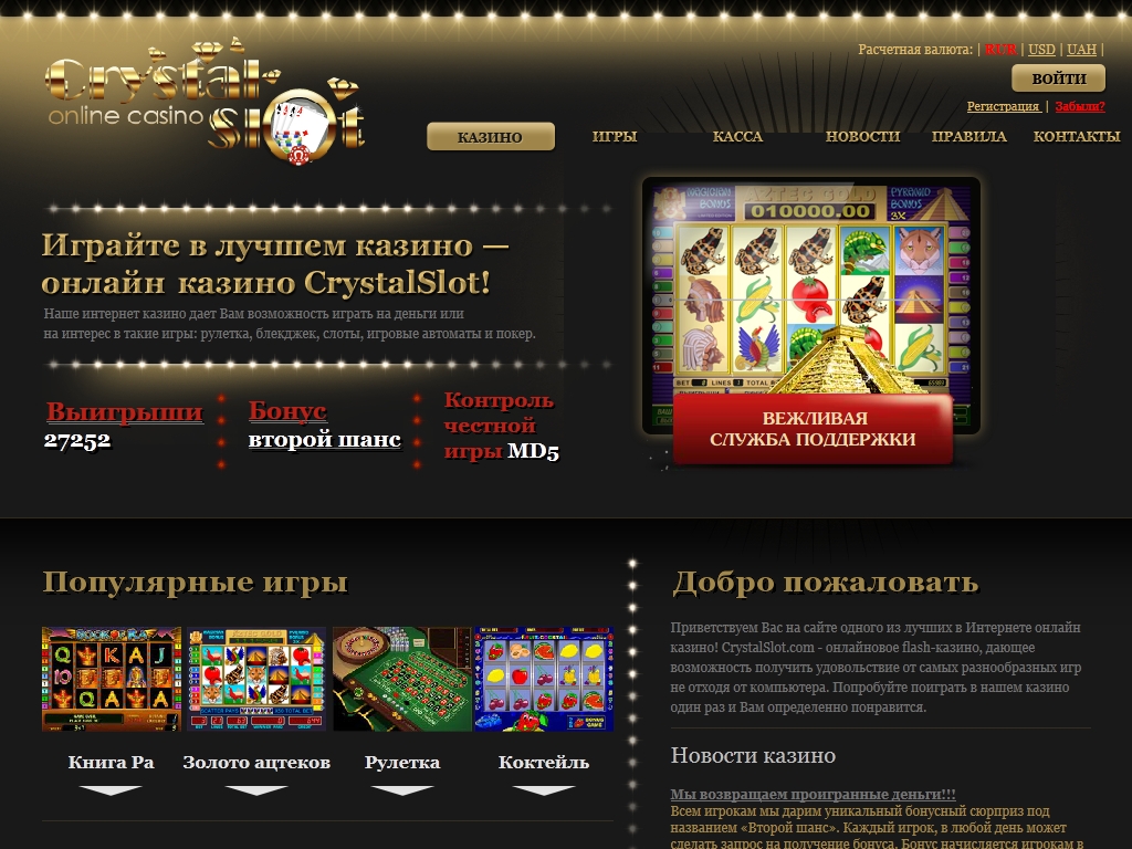 Знакомство с сайтом казино Кристалл-слот оставляет позитивное впечатление. Хотя общий фон главной страницы несколько мрачноват, но общее оформление выполнено в ярких тонах. Лобби-панель предоставляет игрокам всю необходимую информацию об имеющихся играх, ставках, правилах игры, способах пополнения счета и пр. Одно из главных преимуществ казино – это то, что оно создано специально для россиян, в отличие от тех игорных заведений, серверы которых расположены в странах Европы или Америки.