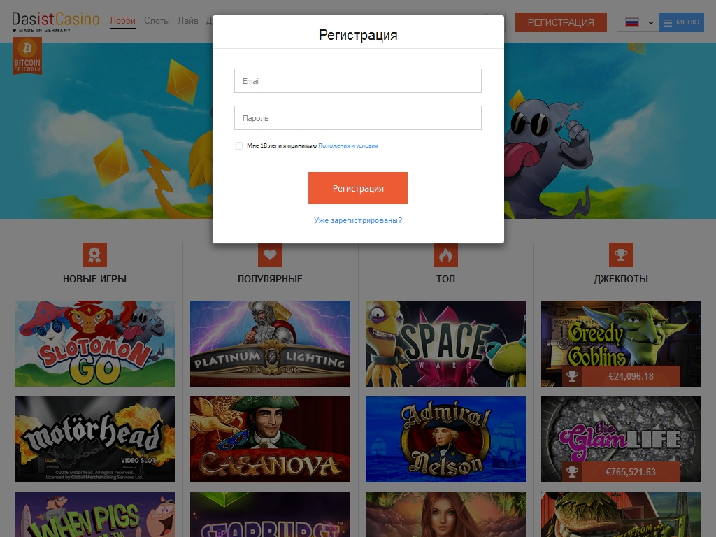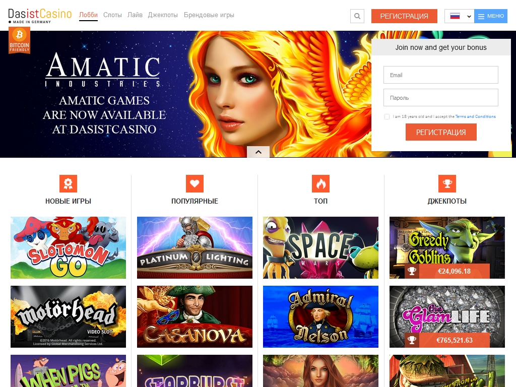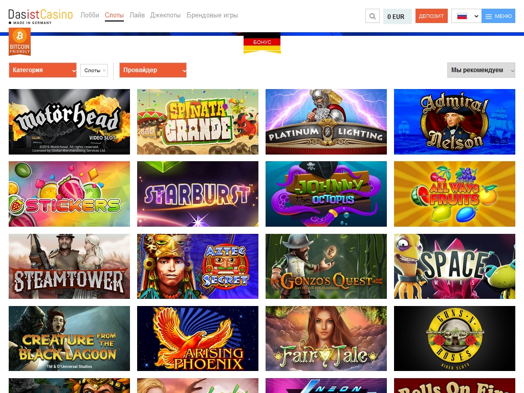 Название на немецком языке, надпись «сделано в Германии» на логотипе – все это заставляет думать, что dasistcasino.com является игорным порталом, ориентированным на пользователей из данной страны. Но на самом деле, клиентами заведения могут становиться игроки из большинства государств, за исключением территорий, указанных в специальном перечне.
