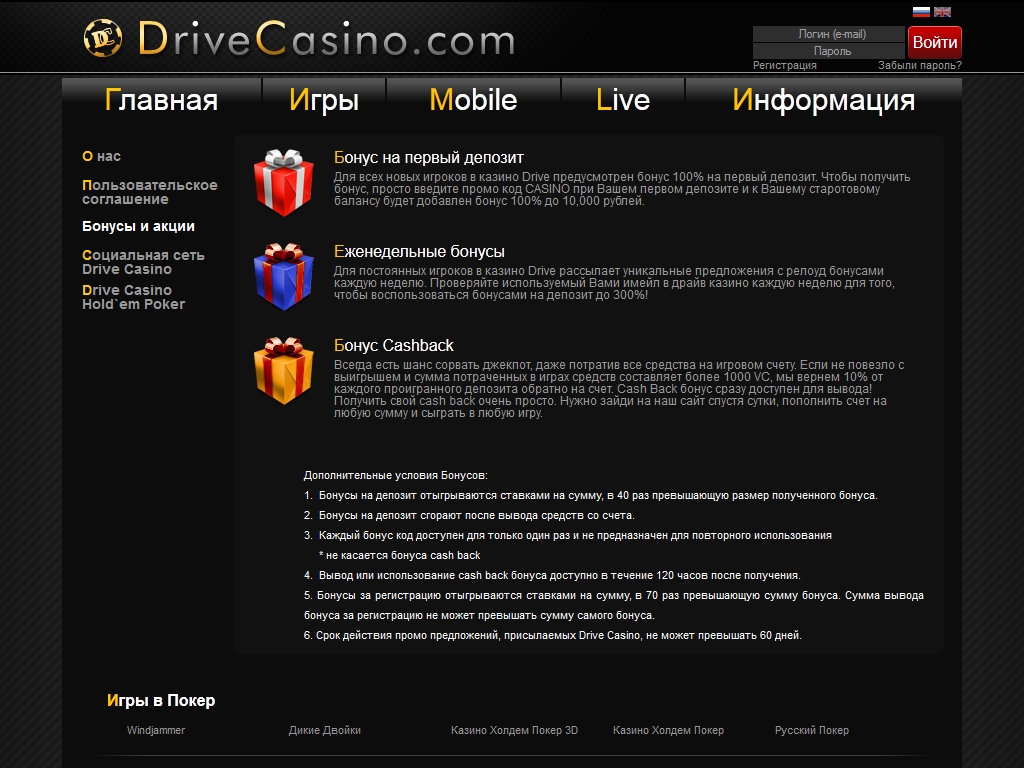 Портал drivecasino.com дает возможность делать тренировочные и реальные ставки в различных азартных онлайн-играх, включая модели с настоящими крупье. Здесь предлагаются интересные бонусы, а также проводятся разнообразные поощрительные акции других типов. Детали в нашем обзоре.