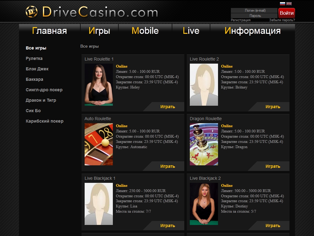 Игры с настоящими крупье вынесены в отдельный раздел портала. Здесь доступны несколько версий рулетки и блэкджека, а также баккара, холдем покер, сик бо, карибский покер и некоторые другие модели. Больше информации об этом виде услуг на данном сайте вы найдете в отдельном обзоре Drive Live.
